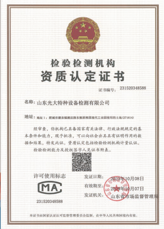 山東光大特種設(shè)備檢測(cè)有限公司是經(jīng)山東省市場(chǎng)監(jiān)督管理局核準(zhǔn)的甲類B1特種設(shè)備綜合檢驗(yàn)機(jī)構(gòu)。2017年9月30日取得了山東省市場(chǎng)監(jiān)督管理局頒發(fā)的《檢驗(yàn)檢測(cè)機(jī)構(gòu)資質(zhì)認(rèn)定證書(shū)》。2018年2月22日取得了山東省市場(chǎng)監(jiān)督管理局頒發(fā)的《特種設(shè)備檢驗(yàn)檢測(cè)機(jī)構(gòu)核準(zhǔn)證》(起重機(jī)械)檢驗(yàn)檢測(cè)資質(zhì)。2021年11月取得山東省市場(chǎng)監(jiān)督管理局版發(fā)的《特種設(shè)備檢驗(yàn)檢測(cè)機(jī)構(gòu)核準(zhǔn)證》(安全閥在線、離線)校驗(yàn)資質(zhì)。2023年11月取得山東省市場(chǎng)監(jiān)督管理局頒發(fā)的甲類檢驗(yàn)機(jī)構(gòu)B1《特種設(shè)備檢驗(yàn)檢測(cè)機(jī)構(gòu)核準(zhǔn)證》,具有壓力容器(RD2...
